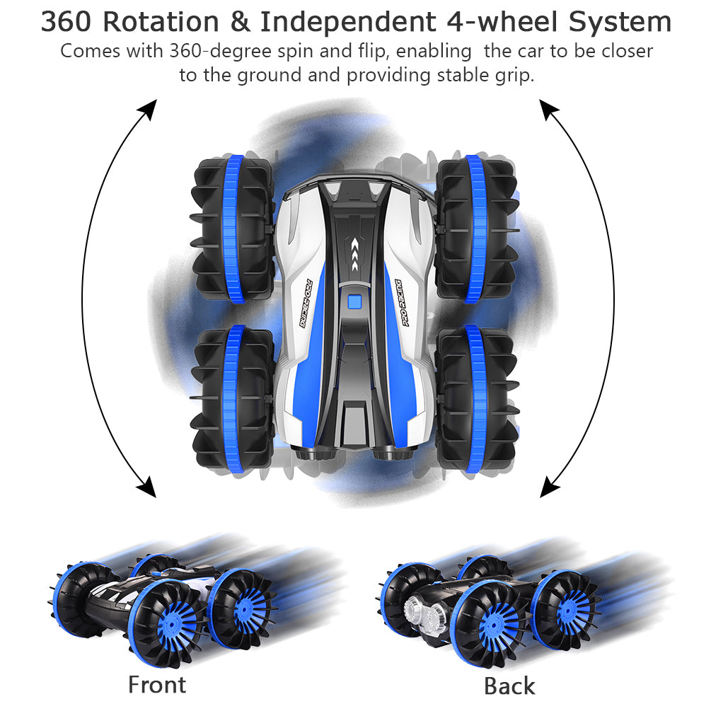 Great Function- Double sided and amphibious RC car, capable to work well on land and water; features 360-degree spin and flip for free control.