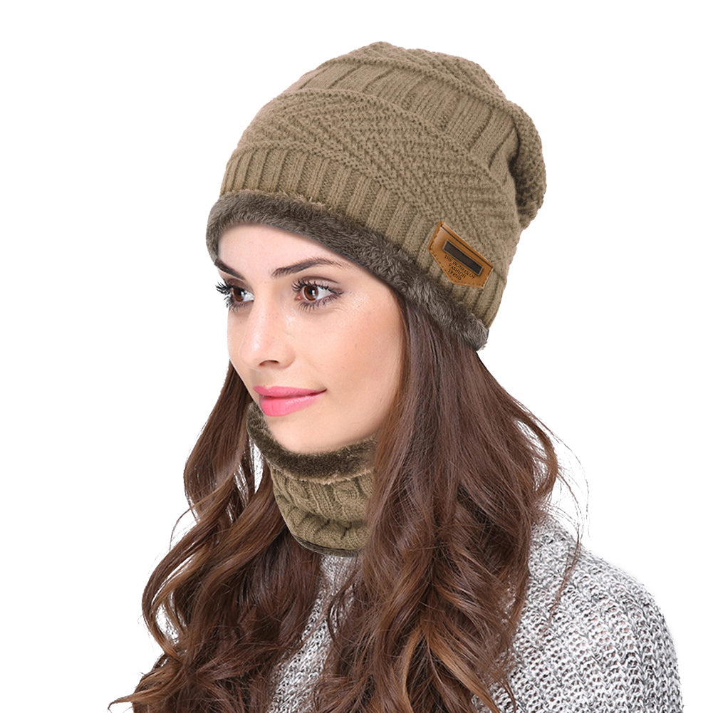 2 Pieces Winter Hat Winter Scarf for Men Warm Beanie Hat Scarf Set Knit Hat & Circle Scarf with Fleece Lining Thick Knit Skull Cap - Khaki
