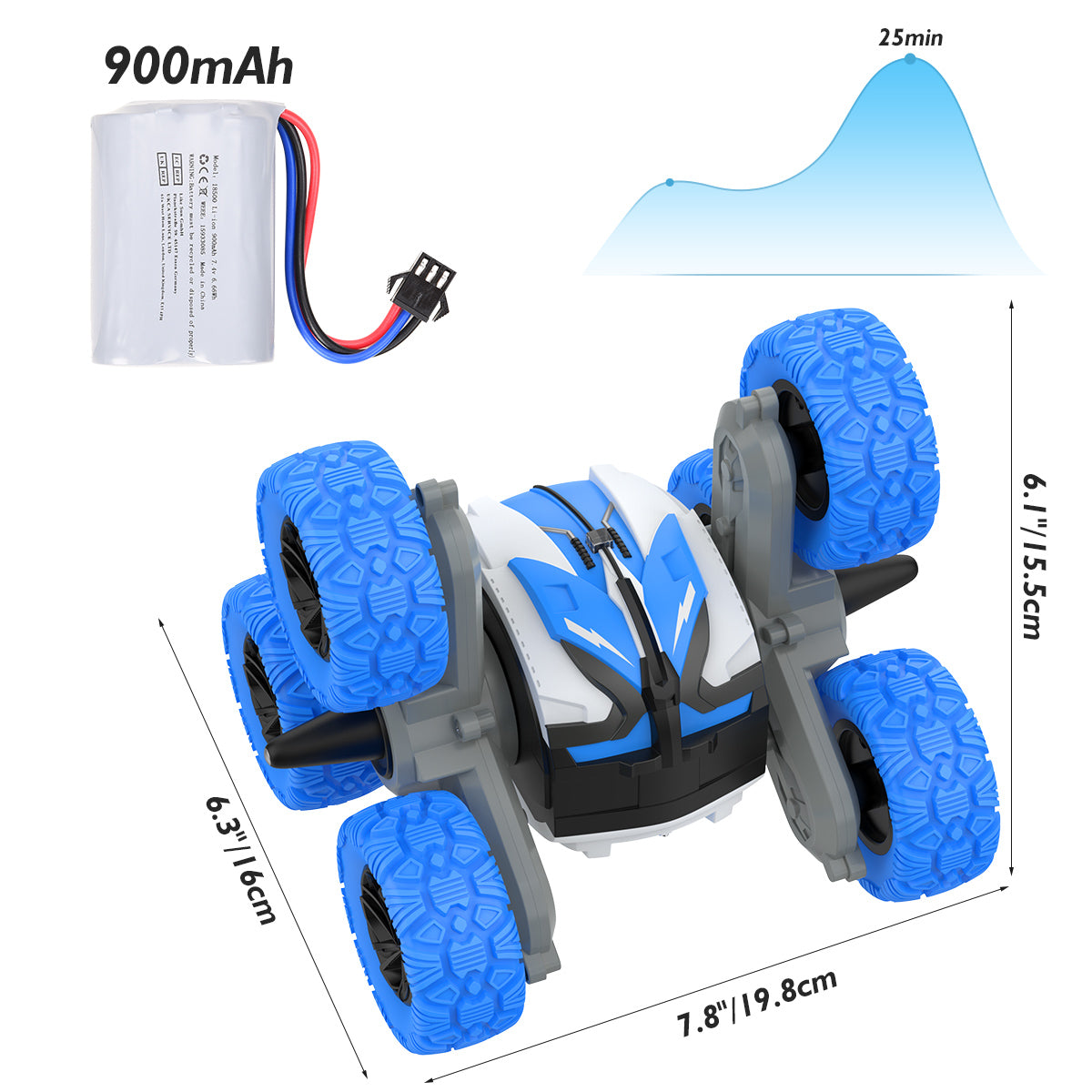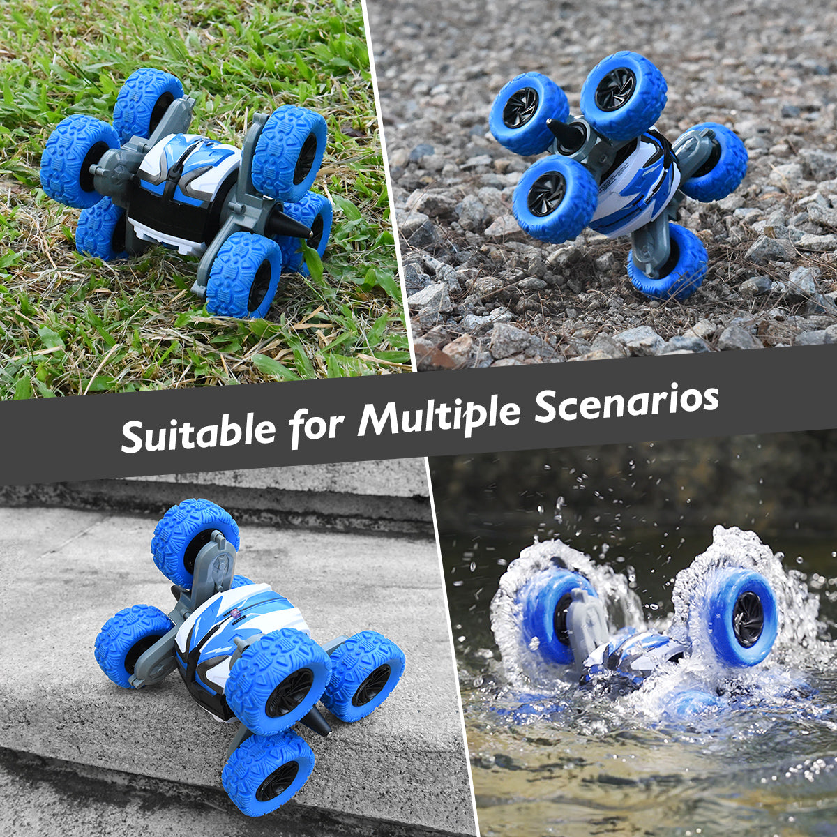 With the cool appearance and awesome stunt functions, this RC car will bring a lot of joy and fun to kids. They can drive their own cars on the grass, on the beach, on the road, even on the stairs and in the water, and control the car to perform thrilling 360° rotation and flip.