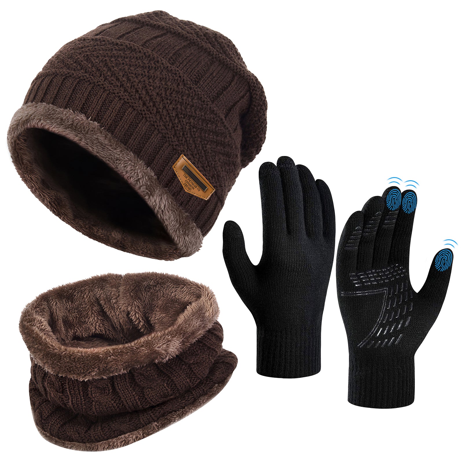Vbiger Men's Acrylic Knit Hat, Scarf & Glove Set, 3pcs Winter Beanie Hat Scarf Set with Gloves Touch Screen Cold Weather Warm Set, Brown