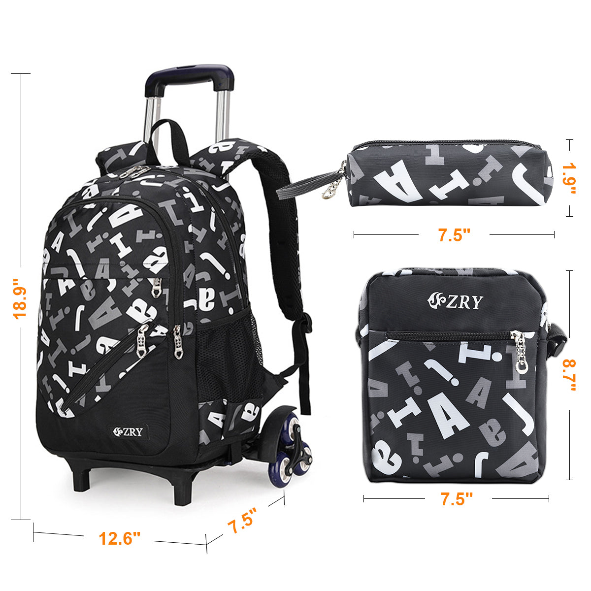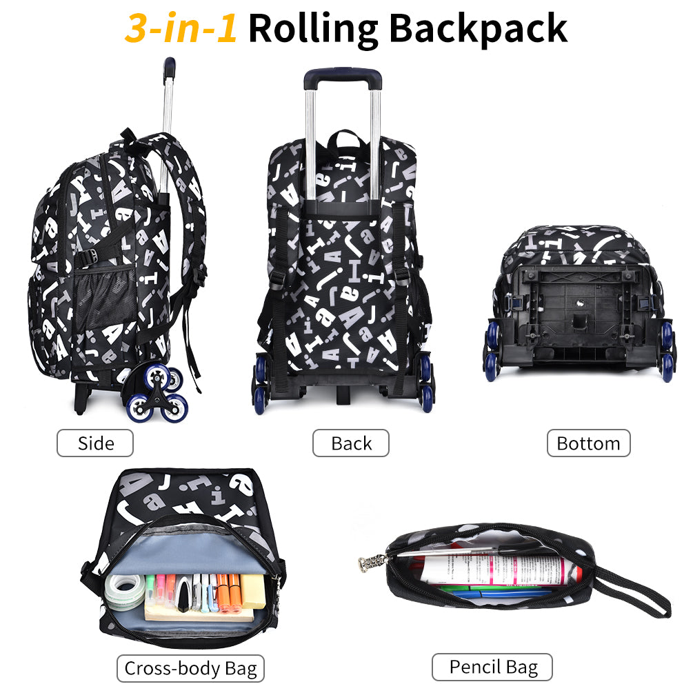 Vibger 3PCS Kids Rolling Backpack - Wheeled Backpack Kids Rolling Bookbag with Cross-Body Bag, Pencil Bag-Black